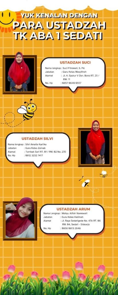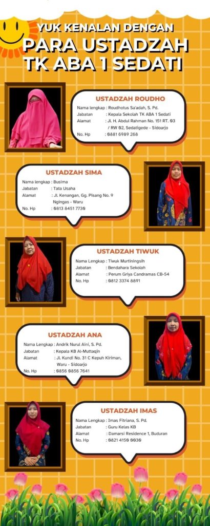 Satuan pendidikan sekolah TK Aisyiyah Bustanul Athfal 1 Sedati Sidoarjo dipimpin oleh seorang kepala sekolah yang berpendidikan Sarjana Pendidikan, 6 guru yang berpendidikan S1 PAUD dan 1 guru berpendidikan S1 Agama, 5 diantaranya sudah mempunyai sertifikat pendidik. Dan 2 guru yang masih kuliah.